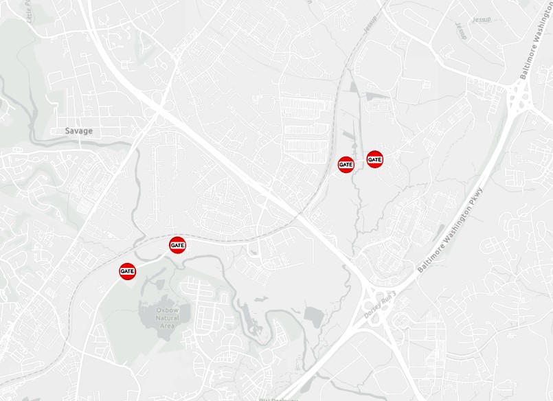 Description: Symbolized as a point feature as a red circle with the word "Gate" in the middle. These point locations are where there are gates at the Contrail (Automatic Flood Warning Systems system) sites. As of Dec 2024, there are 3 different sites/location with gates from Contrail install phases 1-3.
